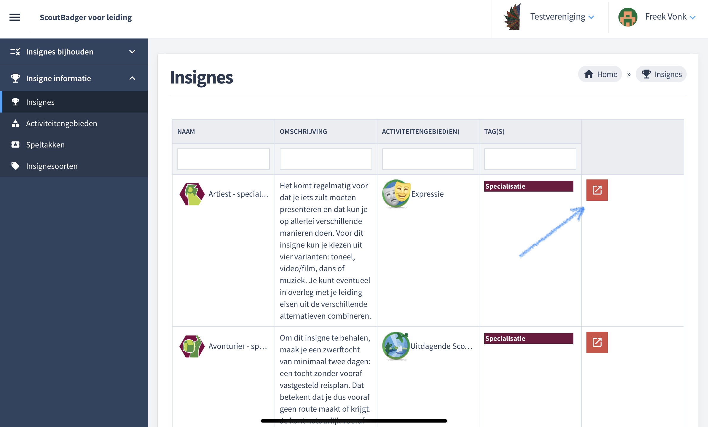 2. Klik aan de linkerkant op: “Insignes” (of een van de andere “Insigne informatie” weergaven) en open (in dit geval) het gewenste insigne.