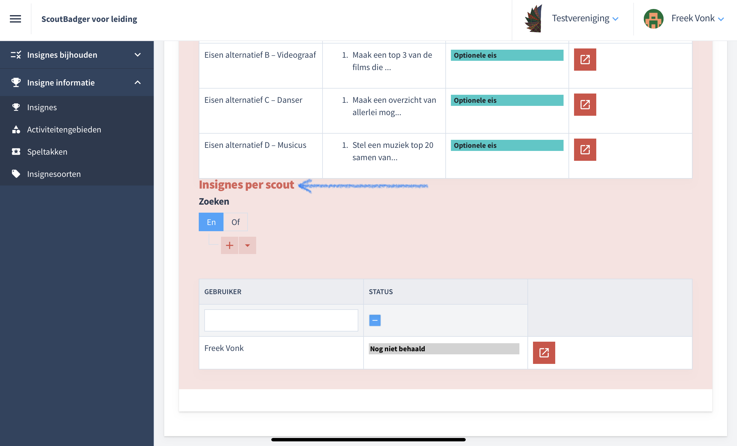 3. Zoek vervolgens onderin naar het kopje: “Insignes per scout” en open het betreffende insigne project.