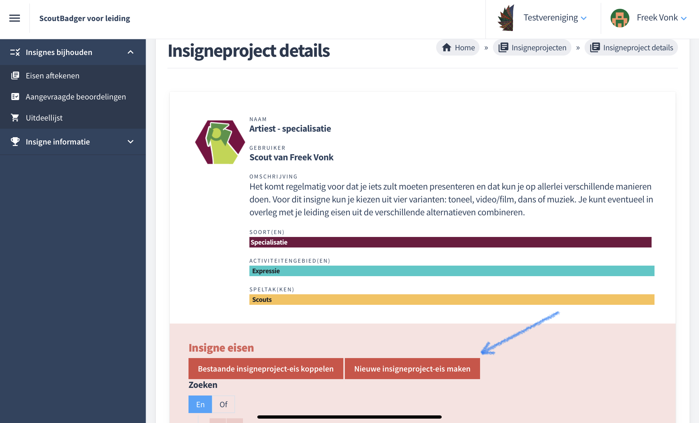 4. Klik vervolgens op: “Nieuwe insigneproject-eis maken” (of, als je een bestaande insigne-eis wilt aanpassen: klik je op het potloodje aan de rechterkant van de insigne-eis)
