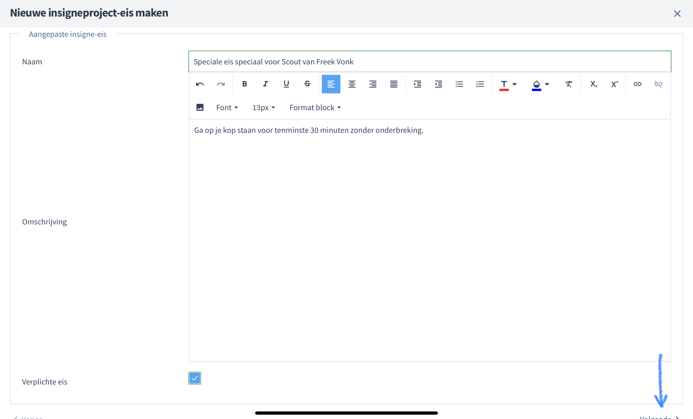 Het aanpassen van een bestaande insigne-eis houdt in dat alleen voor de gekozen combinatie van scout/insigne de eis wordt aangepast. Alle vergelijkbare eisen van andere scouts voor hetzelfde insigne zijn ongewijzigd. Wil je de eis toevoegen aan andere insigne/scout combinaties? Dan kies je in stap 4 voor: “Bestaande insigneproject-eis koppelen” en volg je de stappen zoals ze in het scherm worden getoond.