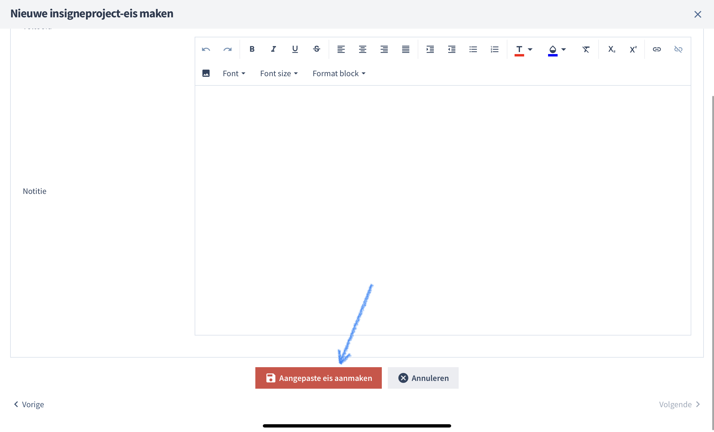 6. Voeg eventueel een notitie toe en klik op: “Aangepaste eis aanmaken” (als je een nieuwe wilt toevoegen) of “Wijzigingen opslaan” als je een bestaande eis hebt aangepast.