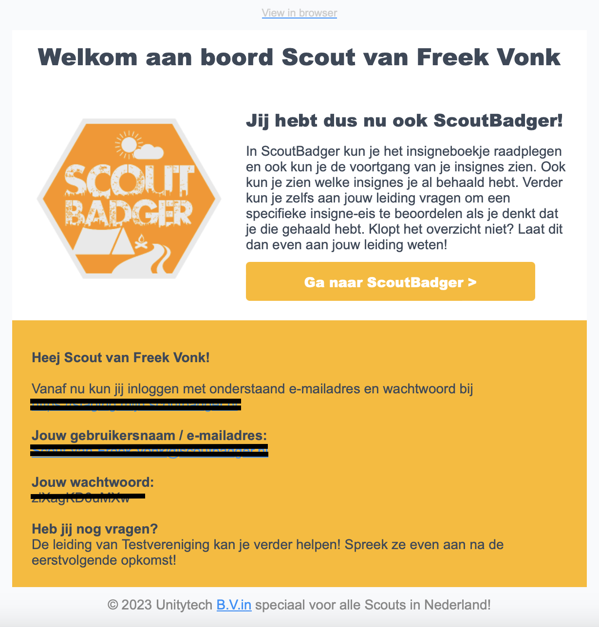 1. Zodra jouw leiding jou heeft toegevoegd aan ScoutBadger, ontvang je een uitnodigingse-mail waarin je de link naar ScoutBadger voor scouts en ook jouw inloggegevens kunt vinden. Gebruik de instructies in de e-mail om in te loggen in ScoutBadger voor scouts. De e-mail ziet er als volgt uit: